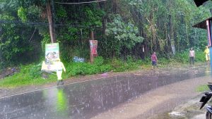 Kejadian yang dipicu cuaca hujan disertai angin tersebut menyebabkan sebatang pohon roboh dan menutupi sebagian badan jalan di persimpangan Desa Pait.