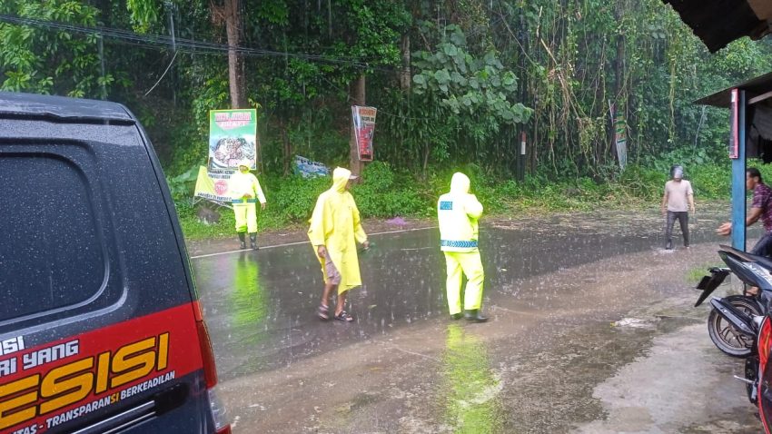 Mereka memberikan arahan kepada pengendara untuk bergantian melintas dan menghimbau untuk berhati-hati mengingat kondisi jalan yang licin akibat hujan.