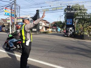 Dalam upaya menjaga kelancaran serta keselamatan para pengguna jalan, Personel Satuan Lalu Lintas (Sat Lantas) Polres Batu melaksanakan kegiatan pengaturan arus lalu lintas dan pelayanan penyeberangan di Simpang 4 Arhanud, Kota Batu, pada Selasa pagi. Kegiatan ini dilakukan menyusul meningkatnya mobilitas masyarakat pada jam-jam sibuk, terutama saat aktivitas sekolah, perkantoran, serta kendaraan barang yang melintas di kawasan tersebut. (02/12/2025)