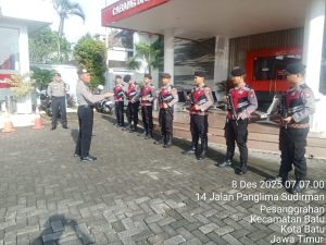 Mohon ijin melaporkan, personel Sat Samapta Polres Batu pada pagi hari ini melaksanakan kegiatan apel pagi sebagai langkah awal sebelum menjalankan tugas pengamanan di Bank Jatim yang berada di wilayah hukum Polres Batu. Kegiatan apel ini dipimpin oleh Perwira Pengendali dan diikuti oleh seluruh anggota yang terlibat dalam pengamanan objek vital tersebut. Apel pagi menjadi momentum penting untuk melakukan pengecekan kesiapan personel, kelengkapan peralatan, serta penyampaian arahan terkait pelaksanaan tugas lapangan. Senin (08/12/.2025)