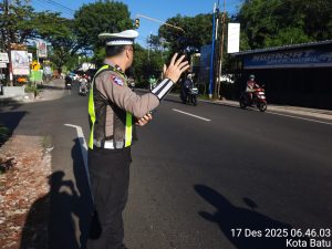Kota Batu – Wujud nyata pengabdian dan kepedulian Polri kembali ditunjukkan oleh Anggota Satlantas Polres Batu yang melaksanakan kegiatan pengaturan arus lalu lintas di Simpang 3 Jalan Soekarno Hatta, tepatnya di depan Warung Nasi Empok, Kota Batu. Kegiatan ini dilakukan sebagai bagian dari pelayanan prima kepada masyarakat guna memastikan kelancaran dan keselamatan pengguna jalan.