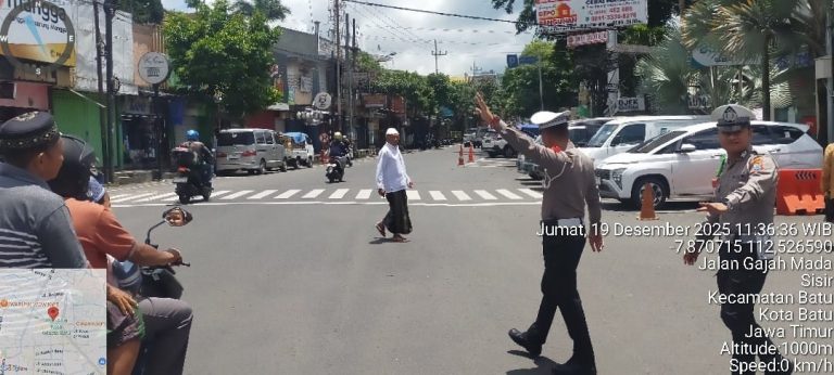 Kota Batu – Guna menciptakan suasana kondusif dan memastikan kelancaran ibadah bagi umat Muslim, personel Satuan Lalu Lintas (Satlantas) Polres Batu melaksanakan kegiatan pengamanan, pengaturan lalu lintas, serta membantu penyeberangan jamaah Sholat Jumat di Masjid An-Nur. Kegiatan tersebut berlangsung, Jum’at (18/12/2025) di Jalan Gajah Mada, Kelurahan Sisir, Kecamatan Batu, Kota Batu, yang merupakan kawasan padat…